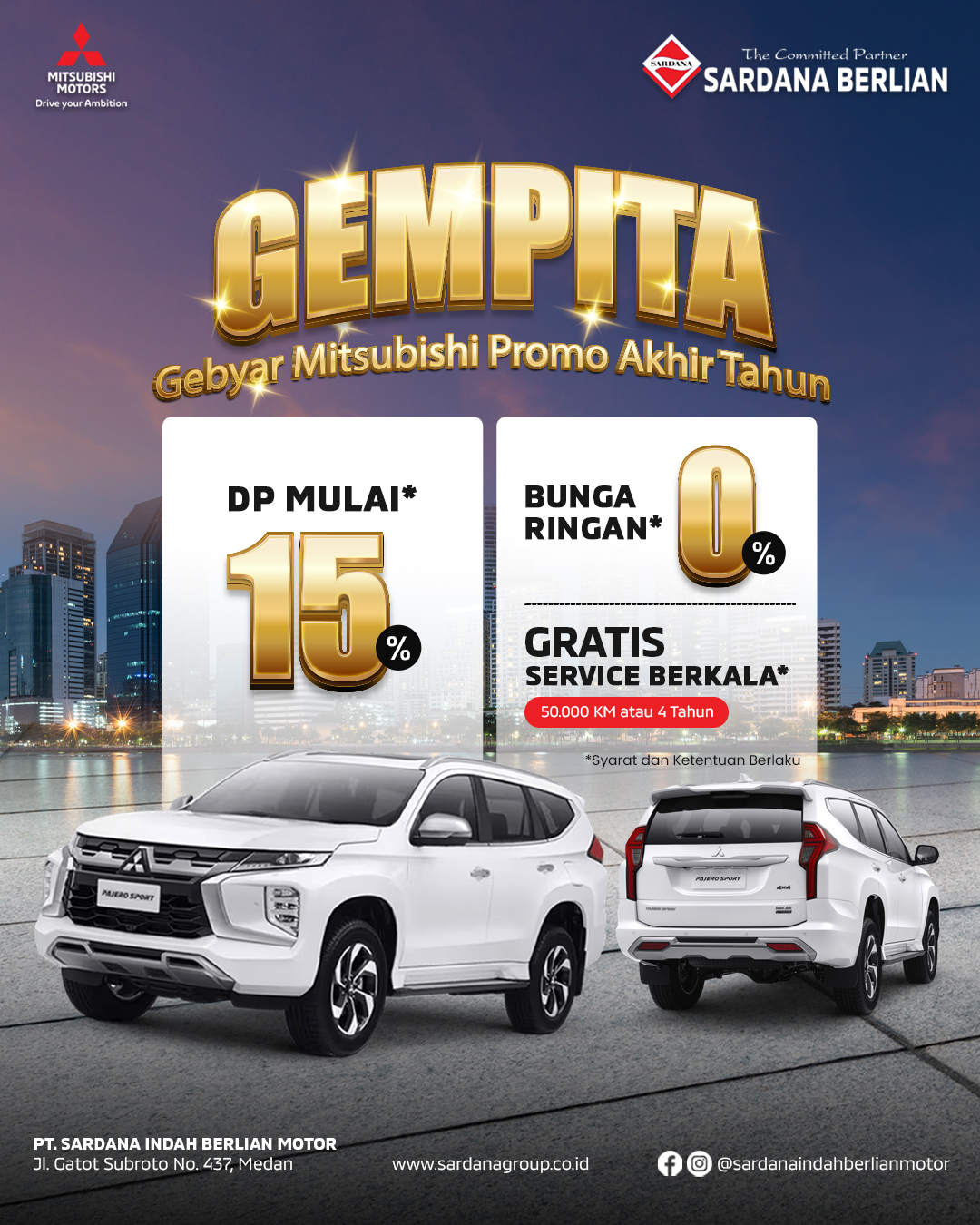 Jangan sampai ketinggalan. Pastikan unit yang Anda inginkan tersedia. Pesan sekarang agar Mitsubishi Pajero Sport bisa menjadi teman perjalanan Anda di momentum pergantian tahun. Dealer Sardana IndahBerlian Motor adalah dealer resmi Mitsubishi di Kota Medan. Kami selalu sedia memberikan pelayanan terbaik untuk memenuhi kebutuhan pembelian mobil Mitsubishi Anda.